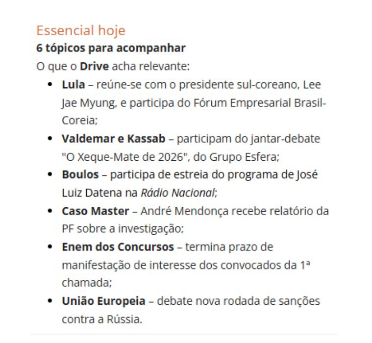 MENDONÇA se reúne com delegados da PF – Além de definir os próximos passos da investigação do caso Master, a nova reunião irá discutir informações já apresentadas pela instituição policial. Ontem, no culto da Igreja Presbiteriana de Pinheiros (SP), o ministro André Mendonça falou sobre vaidades, tentações e testes a que cristãos são submetidos, concluindo que para superar é preciso estar “pleno do espírito de Deus”.