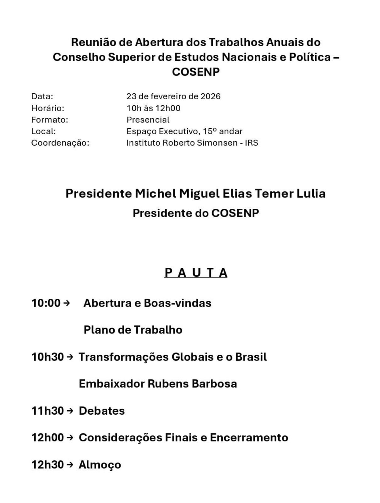 Em São Paulo, às 10h, participo da primeira reunião do ano, do Conselho Superior de Estudos Nacionais e Política ( COSENP), da FIESP