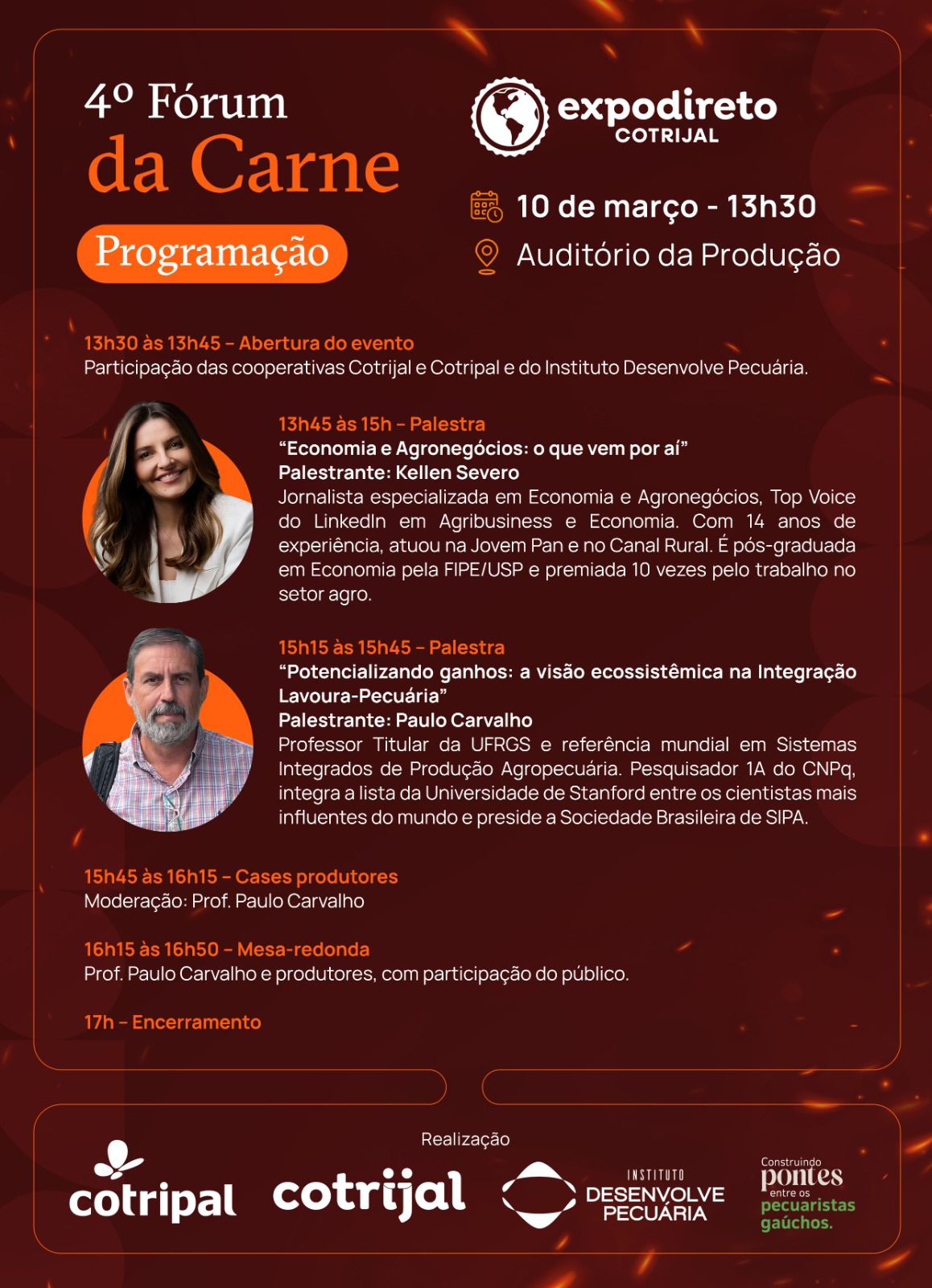 O Instituto Desenvolve Pecuária promove, no dia 10 de março, às 13h30, o 4º Fórum da Carne, dentro da programação da Expodireto Cotrijal em Não-Me-Toque . O encontro será realizado no Auditório da Produção e reunirá especialistas, produtores e lideranças do setor para discutir os rumos da pecuária e do agronegócio brasileiro.