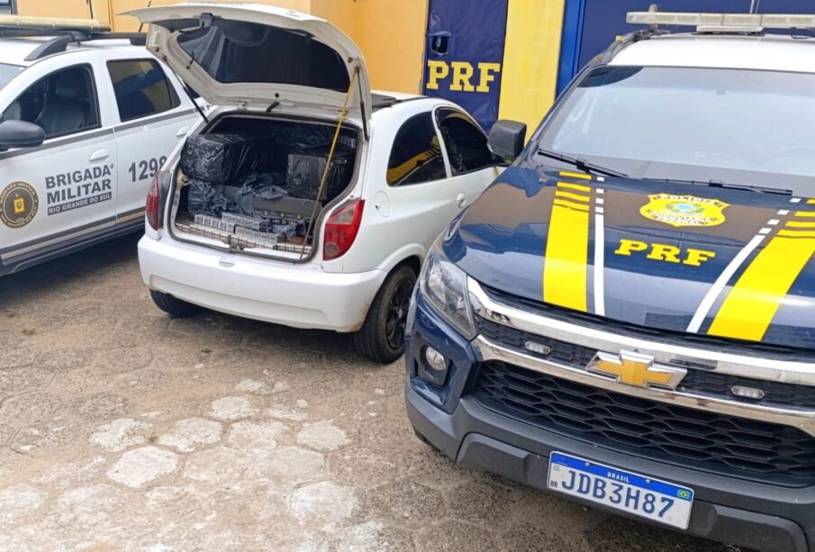 A Polícia Rodoviária Federal, em ação conjunta com a Brigada Militar, apreendeu um veículo carregado com cigarros contrabandeados. A ação ocorreu na manhã desta terça-feira (3), na BR 158 em Sant’Ana do Livramento. Após troca de informações entre a PRF e a Brigada Militar, policiais rodoviários federais abordaram um Celta emplacado em Sant’Ana do Livramento que transitava pela BR 158.