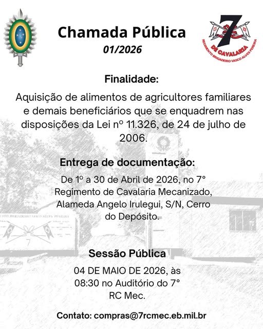 A 7º Regimento de Cavalaria Mecanizado lançou a Chamada Pública nº 01/2026 com o objetivo de adquirir alimentos produzidos por agricultores familiares e demais beneficiários que se enquadram na Lei nº 11.326, de 24 de julho de 2006. A iniciativa busca fortalecer a economia local e valorizar a produção rural da região.