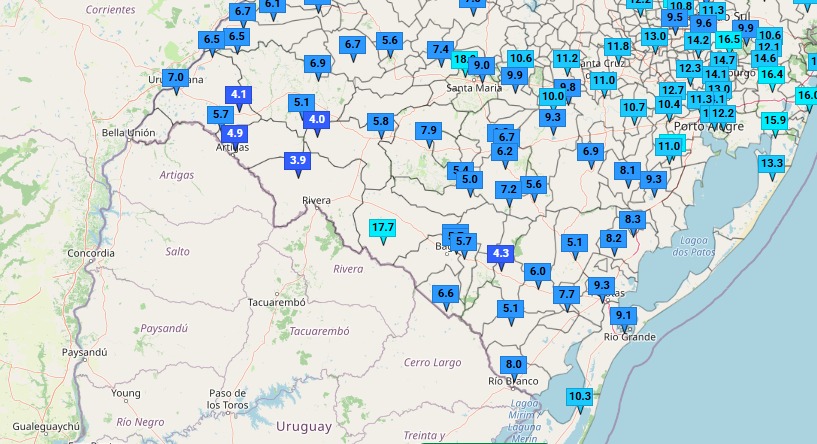 O monitoramento das estações do sistema Simagro, da Secretaria da Agricultura do RS, confirmou que Sant’Ana do Livramento amanheceu com a temperatura mais baixa do estado nesta segunda-feira, 27. O mapa de dados observados mostra registros que chegaram a 3,9°C em pontos específicos do município, como na região do Passo da Sociedade, enquanto a média na zona urbana e cidades vizinhas da Campanha oscilou em torno de 6°C. Esta queda acentuada é explicada pela combinação de um tempo seco persistente e a influência de um ciclone extratropical no mar, que atua “empurrando” a massa de ar frio do centro-sul da Argentina para o território gaúcho.
