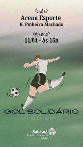 Promovido pelo Rotaract União, o Gol Solidário tem como principal objetivo mobilizar a juventude e a comunidade em torno de causas sociais, utilizando o futebol como ferramenta de engajamento. A cada edição, o projeto direciona seus esforços para uma necessidade específica.