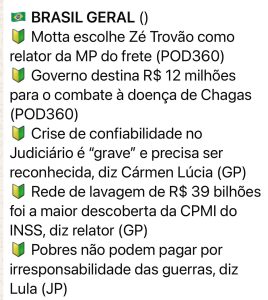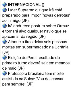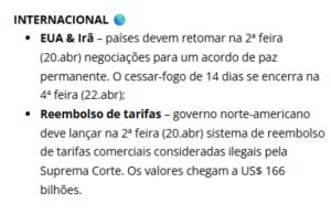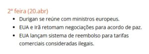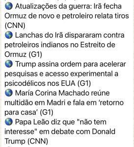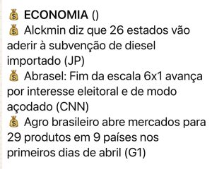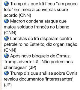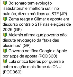 RECADOS de Lula – O presidente Luiz Inácio Lula da Silva mandou recados indiretos ao líder da Casa Branca, Donald Trump, durante discursos realiza dos no fim de semana, na Europa, onde cumpre agenda até quarta–feira. Ontem, o petista chamou de “maluquice” o conflito entre EUA, Israel e Irã, durante pronunciamento realizado na cerimônia de abertura da feira Industrial de Hanôver, na Alemanha. “O Brasil é um dos países menos afetados pela maluquice da guerra feita com o Irã. Nós não estamos sofrendo o aumento do preço do petróleo como muitos países estão sofrendo, porque o governo tomou medidas, e o Brasil só importa 30% do seu óleo diesel”, afirmou. Ao retirar o Brasil de possíveis choques no preço do petróleo, Lula enfatizou os anúncios do governo federal que envolveram subsídios e isenções de impostos a combustíveis como diesel (nacional e importado), biodiesel, gás liquefeito de Petróleo — o gás de cozinha (GLP) — e querosene de aviação. Antes de considerar como “maluquice” o conflito iniciado em março pelos Estados Unidos, Lula fez outra citação indireta a Trump, no sábado, no Fórum em Defesa da Democracia, em Barcelona, na Espanha. À ocasião, ele disse que o mundo não poderia ser guiado por um tuíte, em referência a post na rede social, de líderes de Esta do. “Não podemos levantar todo dia de manhã e ir se deitar todo dia à noite com um tuíte de um presidente da república ameaçando o mundo, fazendo guerra”, discursou, após dizer que “nenhum presidente” tem o “direito” de impor regras a outros países.
