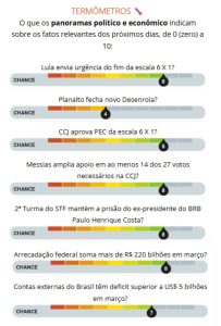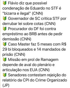 TUDO sob controle – O presidente da Câmara, Hugo Motta (Republicanos-PB), e mais seis deputados concentraram no ano passado a indicação de R$ 1,5 bilhão em emendas de comissão ao Orçamento, verba distribuída pelos colegiados temáticos do Congresso. É um quinto do total de R$ 7,5 bilhões repassado pelas comissões da Câmara em 2025 para ações nas bases eleitorais. Essas emendas eram secretas até 2024, sem que o nome do padrinho político responsável pela indicação da verba fosse divulgado. Levantamento da Folha, mostra que o deputado federal que, sozinho, mais indicou emendas de comissão em 2025 foi Júlio Arcoverde (PP-PI), com R$ 244,3 milhões. Ele presidiu a CMO (Comissão Mista de Orçamento) do Congresso, responsável por votar os projetos de lei orçamentários. Ele diz que todas foram destinadas de forma legal. O segundo é Hugo Motta, com R$ 180,5 milhões. Quase metade deste valor foi repassado a cidades cujo prefeito declarou publicamente apoio à pré-candidatura ao Senado de Nabor Wanderley, pai do presidente da Câmara. Motta afirma que a indicação respeita rigorosamente um acordo entre os três Poderes.