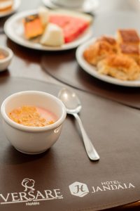 O café da manhã do Hotel Jandaia é servido diariamente, das 7h às 10h, em um ambiente confortável e acolhedor.