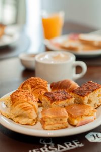 Servido diariamente, o café da manhã do hotel reúne uma variedade de opções que atendem diferentes perfis e preferências. Pães artesanais recém-preparados, frios selecionados, bolos e tortas caseiras dividem espaço com um cardápio equilibrado, que inclui frutas frescas, iogurtes, cereais e sucos naturais, oferecendo alternativas mais leves e saudáveis para começar o dia.