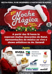A Noite Mágica vai acontecer no dia 16 de dezembro, sexta-feira, em Rivera. A vigésima primeira edição do evento ocorre dentro de um Festival de Música criado pela Intendência Departamental, com apresentação do artista local Matheus Carvalho. Também contará com outras atrações artísticas no decorrer da noite. A expectativa para este ano é maior, visto […]