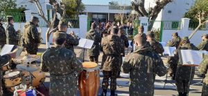 Banda do 7º RC Mec realiza apresentação na porta de lar da velhice para entreter moradores