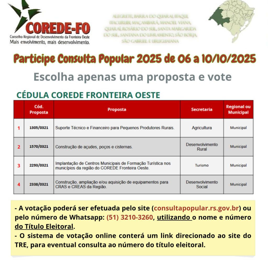 A Consulta Popular 2025 já está aberta, e os moradores da região da Fronteira Oeste podem participar escolhendo uma das propostas disponíveis para receber investimentos do Governo do Estado. A votação acontece de 6 a 10 de outubro de 2025, de forma totalmente online, e é uma oportunidade para que a comunidade defina onde serão aplicados os recursos públicos no
