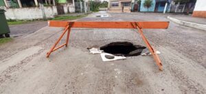 Via construída com galerias de escoamento de água, está com diversos buracos e acende alerta para novas enchentes