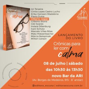 O lançamento do livro acontece nesse sábado(8) a partir das 10h30 às 13h30 no Novo Bart da ARI (Av. Borges de Medeiros, 915 – 8º andar). O livro contem vários autores como Gilberto Jasper. instagram: https://www.instagram.com/editora_escuna/ Site: https://editoraescuna.com.br/