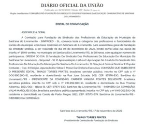 COMISSÃO PRÓ-FUNDAÇÃO DO SINDICATO DOS PROFISSIONAIS DA EDUCAÇÃO DO MUNICÍPIO DE SANTANA DO LIVRAMENTO EDITAL DE CONVOCAÇÃO ASSEMBLEIA GERAL A Comissão para Fundação do Sindicato dos Profissionais da Educação do Município de Sant’ana do Livramento – SINPROED – SL, convoca toda a categoria dos professores e funcionários de escola do município, com base territorial em […]
