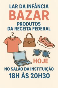 O Lar da Infância convida toda a comunidade para participar do nosso Bazar Solidário com produtos recebidos da Receita Federal! ❤️ Toda a renda será destinada à manutenção das atividades da instituição e ao cuidado das crianças e adolescentes acolhidos. 🛍️ O que você vai encontrar? * 🫗 Jarras elétricas * 🧦 Meias diversas […]