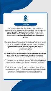 Interrupção no abastecimento começa às 8h para avanço em rede de drenagem; DAE disponibiliza caminhão-pipa para socorrer moradores.