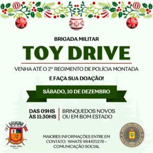 O 2° Regimento de Polícia Montada (RPMon) iniciou sua Campanha de Natal com a arrecadação de brinquedos para as crianças e materiais de higiene para idosos do Asilo Sebastião Percílio. O comandante do 2° RPMon, major Anibal Silveira, solicitou ajuda da comunidade na atividade que será realizada com os idosos, com doação de lanches e […]